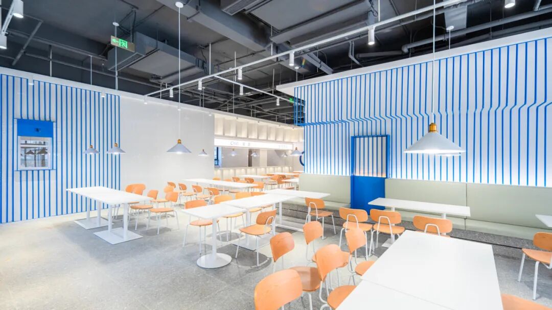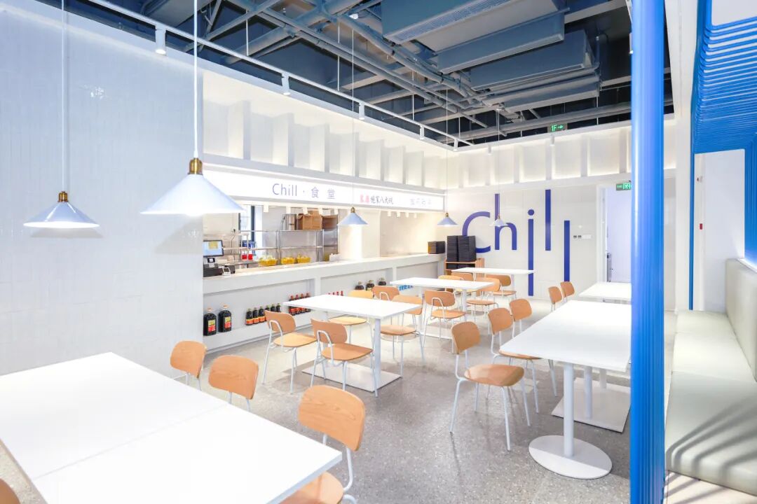 走進(jìn)“CHILL”食堂,藍(lán)白裝飾簡(jiǎn)約而清新,食堂內(nèi)既有適合朋友小聚的多人桌,也有適合獨(dú)自用餐的小桌,i人吃飯也可以很自由。