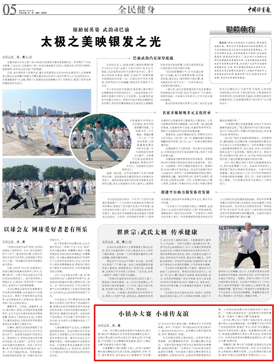 今天,《中國體育報》第5版報道了《小鎮(zhèn)辦大賽小球傳友誼》,講述了臨浦鎮(zhèn)舉辦第三屆“青云杯”最強戰(zhàn)隊乒乓球團體邀請賽,展現(xiàn)“小鎮(zhèn)辦大賽”的風(fēng)采與規(guī)劃。