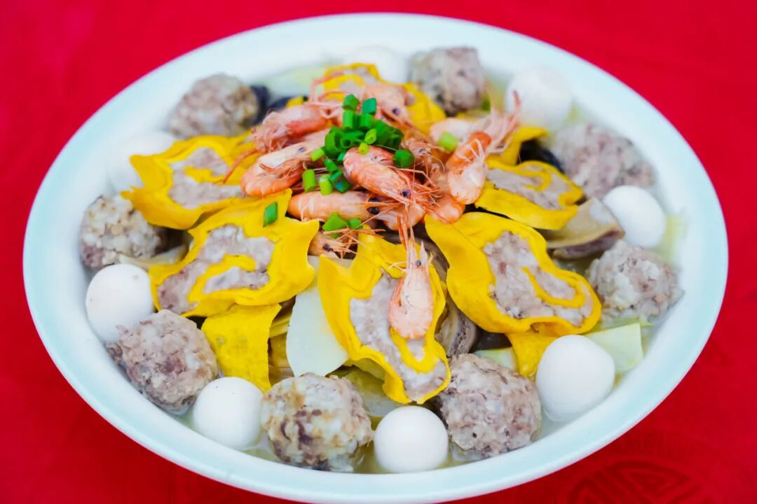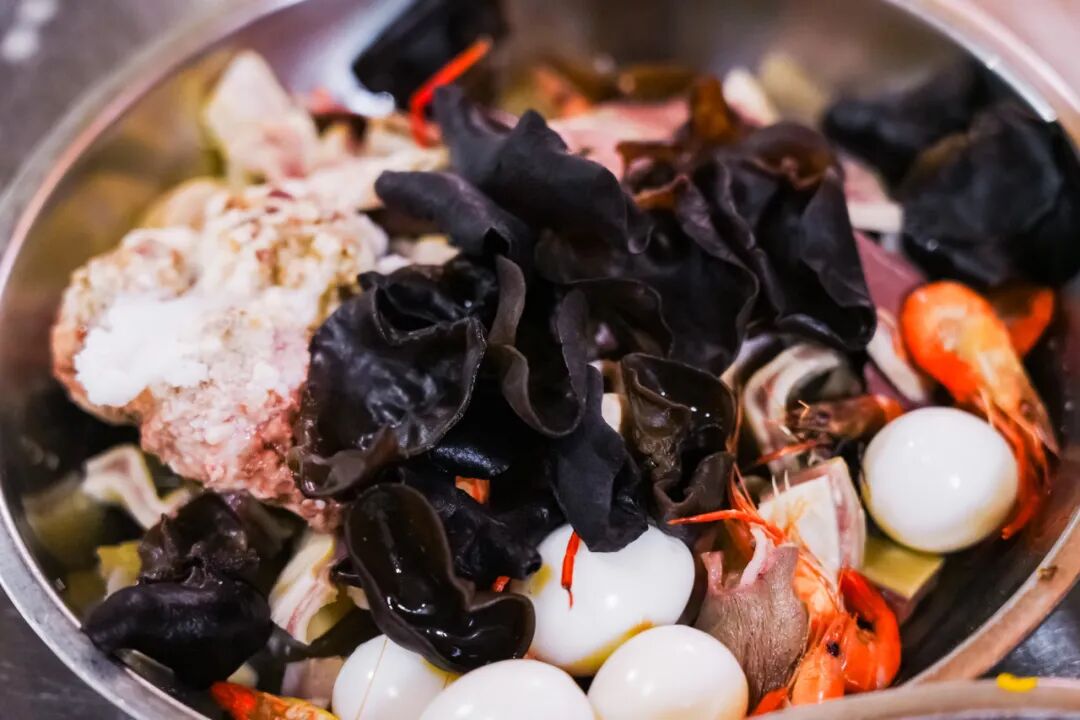 蓋上煮熟的蛋餃、鵪鶉蛋、肉丸
