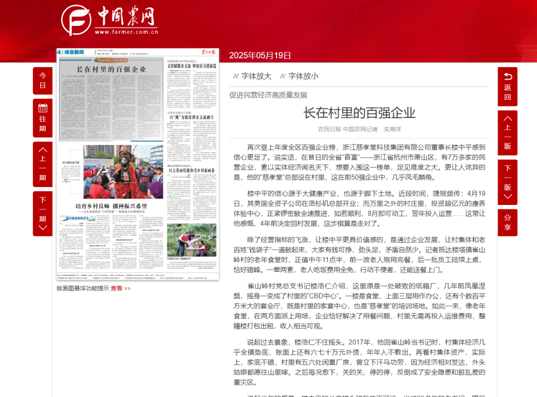 5月19日,農(nóng)民日報 以《長在村里的百強企業(yè)》為題 對樓塔企業(yè) 浙江慈孝堂科技集團有限公司 進行深度報道 長在村里的百強企業(yè) 再次登上年度全區(qū)百強企業(yè)榜,浙江慈孝堂科技集團有限公司董事長樓中平感到信心更足了。說實話,在昔日的全省“首富”——浙江省杭州市蕭山區(qū),有7萬多家的民營企業(yè),素以實體經(jīng)濟聞名天下,想要入圍這一榜單,足見難度之大。更讓人詫異的是,他的“慈孝堂”總部設在村里,這在前50強企業(yè)中,幾乎鳳毛麟角。 樓中平的信心源于大健康產(chǎn)業(yè),也源于腳下土地。近段時間,捷報頻傳:4月19日,其美國全資子公司在洛杉磯總部開業(yè);而萬里之外的村莊里,投資超億元的康養(yǎng)體驗中心,正緊鑼密鼓全速推進,如若順利,8月即可動工,翌年投入運營……這常讓他感慨,4年前決定回村發(fā)展,這步棋算是走對了。 除了經(jīng)營指標的飛漲,讓樓中平更具價值感的,是通過企業(yè)發(fā)展,讓村集體和老百姓“錢袋子”一道鼓起來,大家有錢可掙,勁頭足,矛盾自然少。記者抵達樓塔鎮(zhèn)雀山嶺村的老年食堂時,正值中午十一點半,前一波老人剛用完餐,后一批員工陸續(xù)上桌,恰好錯峰。一葷兩素,老人吃飯費用全免,行動不便者,還能送餐上門。 雀山嶺村黨總支書記樓浩仁介紹,這里原是一處破敗的紙箱廠,幾年前鳳凰涅槃,搖身一變成了村里的“CBD中心”。一樓是食堂,上面三層用作辦公,還有個數(shù)百平方米大的宴會廳,既是村里的家宴中心,也是“慈孝堂”的培訓場地。如此一來,像老年食堂,在兩方面派上用場,企業(yè)恰好解決了用餐問題,村里無需再投入運維費用,整幢樓打包出租,收入相當可觀。 說起過去景象,樓浩仁不住搖頭。2017年,他回雀山嶺當書記時,村集體經(jīng)濟幾乎全鎮(zhèn)墊底,賬面上還有六七十萬元外債,年年入不敷出。再看村集體資產(chǎn),實際上,家底不錯,村里有五六處閑置廠房,曾立下汗馬功勞,因為經(jīng)濟相對發(fā)達,外頭姑娘都愿往山里嫁。之后每況愈下,關的關、停的停,反倒成了安全隱患和臟亂差的重災區(qū)。 說起當年的盛景,樓中平的父親樓永璋就功不可沒。當過20多年的老書記,眼見村子由盛入衰,老人家亦是痛心疾首,又無可奈何。樓浩仁年紀輕、思路活,就想著怎樣把“包袱”變財富,一有機會就找在外打拼的能人,希望他們能為村里出謀劃策。慢慢地,樓中平心中的鄉(xiāng)情被勾起。 樓中平初中畢業(yè)后,進了重點高中,兩個禮拜后竟叛逆輟學,進城去當泥工,后來又參軍入伍,轉業(yè)后好不容易進了鄉(xiāng)政府,可4年后扔掉“鐵飯碗”,下海勇闖深圳,這才淘到“第一桶金”。轉眼到了2020年,彼時的“慈孝堂”已小有名氣,正值上升期,準備買地擴產(chǎn)能,不少地方向他拋出橄欖枝。 “那年,連戰(zhàn)略合作協(xié)議都簽了,可眼見村里這番境況,我也很揪心。坦率講,回村之舉固然有鄉(xiāng)土情結的成分,但站在發(fā)展角度,這何嘗又不是一次機遇,尤其看到鄉(xiāng)村變化翻天覆地,好生態(tài)與大健康產(chǎn)業(yè)有廣闊發(fā)展空間。村里基礎設施看似薄弱,可未來前景,說不定比工業(yè)園更有做頭?!睒侵衅教寡缘?,使他更心動的是幾方商定的合作模式,以及完備的營商環(huán)境。 依照約定,雀山嶺村搞美麗鄉(xiāng)村提升村改造,有1300萬元的項目資金,雖錢不多,但鎮(zhèn)村兩級前瞻性地拿出六成,用于廢舊廠房改造。既然已引來鳳凰,就要量身定制為其筑巢。由此,企業(yè)無需從土地招拍掛、廠房建設等重新來過,既可大大提速,又能輕裝上陣,交付后即裝修投運,村里也能立馬變現(xiàn)獲益,激活“造血功能”。 這是一場“雙向奔赴”。地處蕭山南部山區(qū)的樓塔,也格外珍惜“慈孝堂”把總部設在了村里,為了保障各個項目穩(wěn)步推進,當即成立工作專班,鎮(zhèn)村干部多次協(xié)調推進、全程陪跑,正是得益于優(yōu)渥的營商環(huán)境,這才有了立竿見影的落地效果。 樓中平算了一筆賬,因為不用買土地、建廠房,至少省下30%投入,這部分錢“肥水不流外人田”,每年給村集體帶來60萬元的經(jīng)營性收入,關鍵還提供了近300個就業(yè)崗位,其中九成屬于本地勞動力。在樓塔鎮(zhèn)黨委委員、組織委員潘路平看來,這恰好解決了“閑房、閑人、閑地”三大問題,對山村共富大有裨益。 潘路平告訴記者,幾年間,黨建引領發(fā)揮了重要作用,鎮(zhèn)里與“慈孝堂”簽訂協(xié)議,成立“樓塔文旅康養(yǎng)村社”共富工坊,像閑置房屋改造而來的“康養(yǎng)村舍”,低收入農(nóng)戶參與的“芽菜共富”,通過這些“兩山康養(yǎng)造血項目”的落地見效,企業(yè)的農(nóng)文旅板塊得以豐富,村里的“三閑”得以激活。去年,雀山嶺村集體經(jīng)營性收入突破160萬元。更關鍵的是,樓塔康養(yǎng)的招牌開始聲名鵲起。 據(jù)了解,樓塔鎮(zhèn)歷史上有位先賢,名叫樓英,生于明代醫(yī)學世家,著有《醫(yī)學綱目》,在中醫(yī)界地位舉足輕重,當?shù)剡€有一座百藥山,文化底蘊頗為深厚。樓中平一直希望將“樓英”IP發(fā)揚光大,其“慈孝堂”的品牌核心定位“惠天下”,就與樓英的精神一脈相承,更與樓塔的資源稟賦渾然天成。 讓樓中平更加欣慰的是,如今,這些事業(yè)后繼有人。當他作為共產(chǎn)黨員,賡續(xù)老父親的事業(